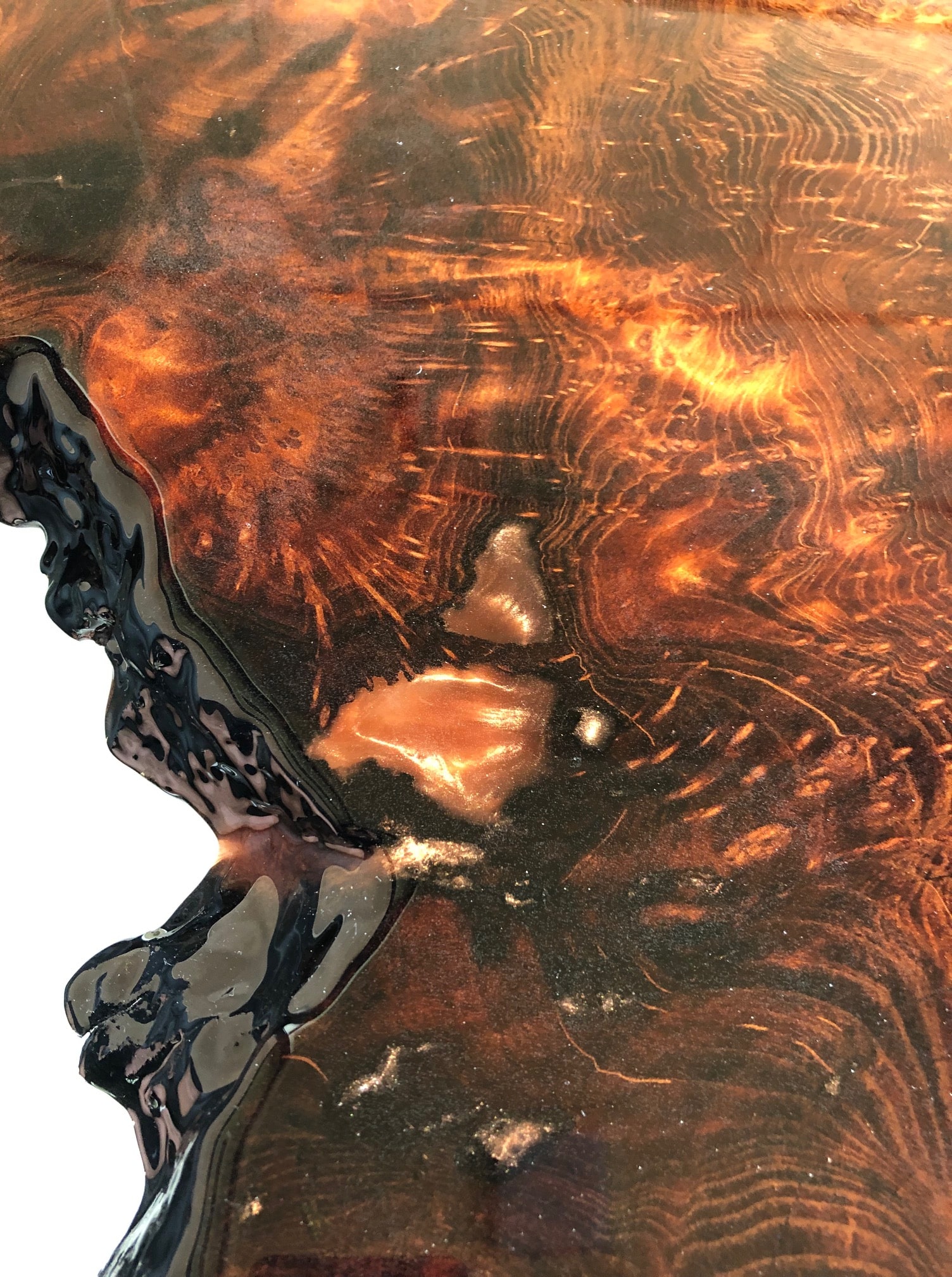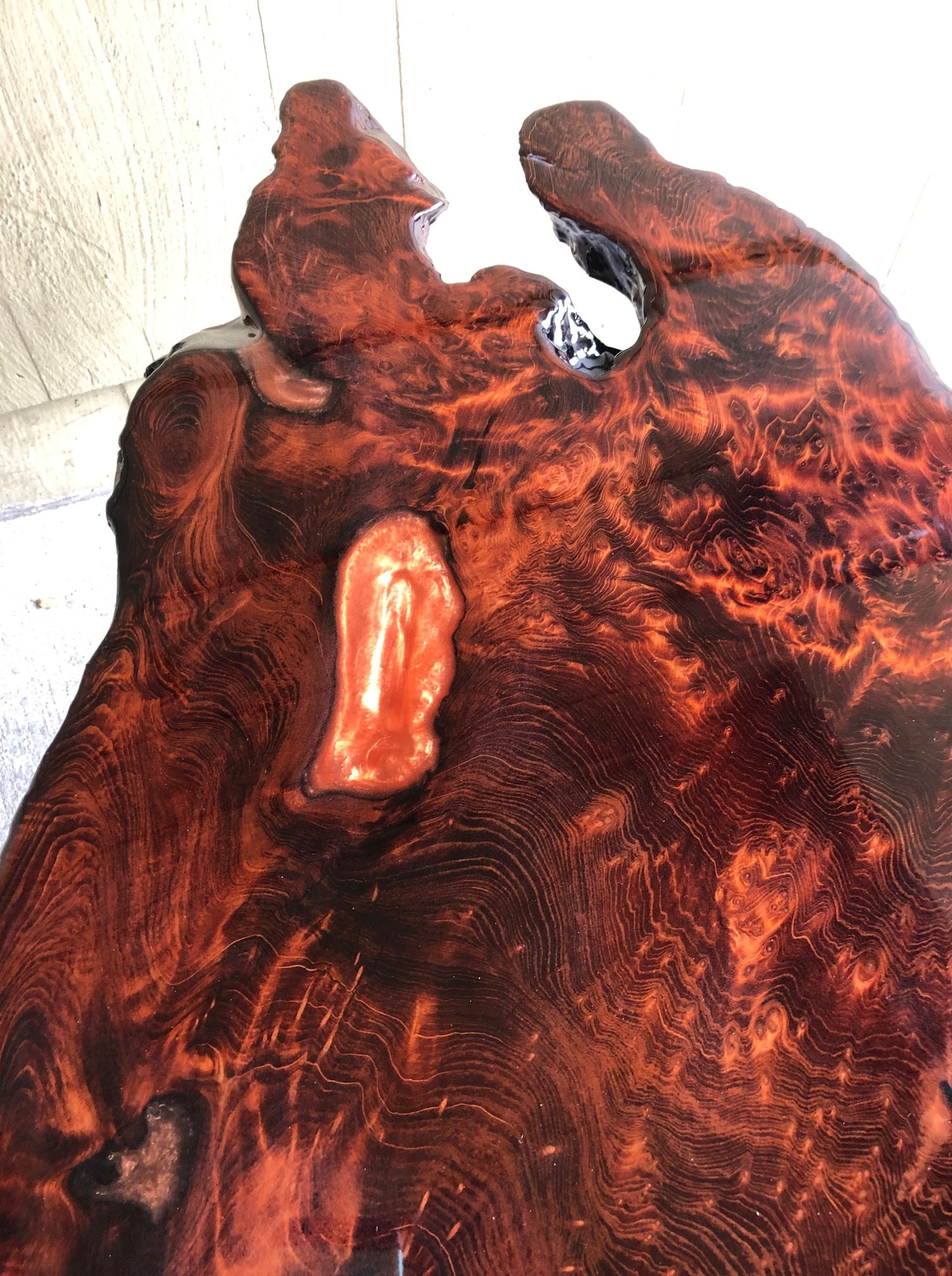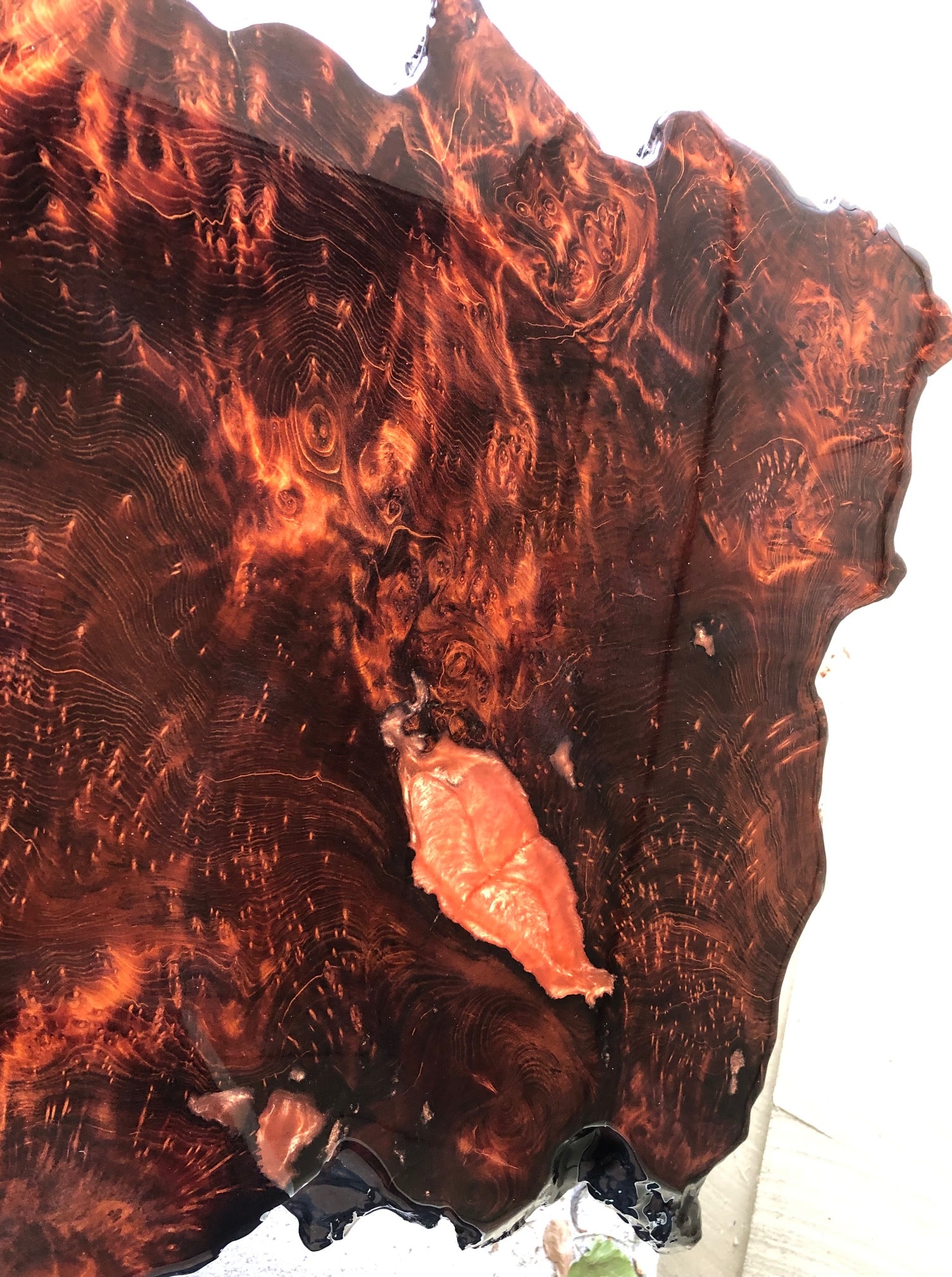 (Made of Natural Redwood Slab with Copper Tinted Epoxy. Hairpin Legs)